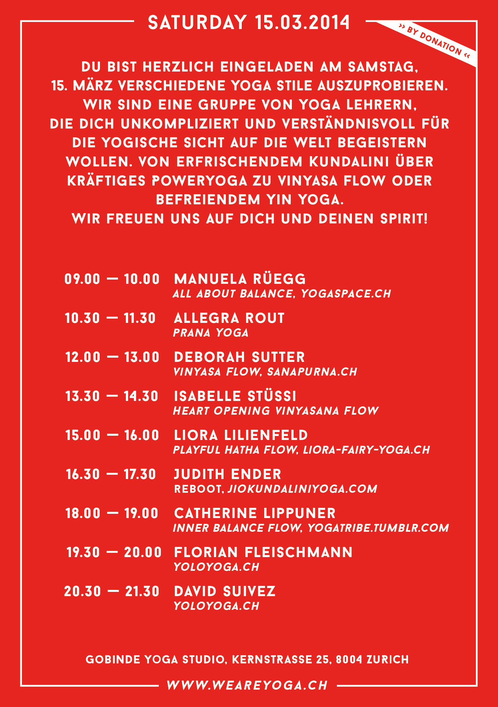 Häufig berichte ich über verschiedene Yoga Arten, um die Bandbreite der Möglichkeiten vorzustellen. Wirklich mehr als passend dazu, gibt es diesen Samstag den 15.3.2014 in Zürich ein ganz großartiges Festival: WE ARE YOGA ZÜRICH - 9 Stunden (a 60 Min.) - 9 Lehrer - 9 Yoga Arten